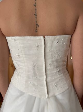 Elegante vestido de novia color blanco. - Espalda escotada en forma de corazón con encaje. - Cierre de botones forrados a lo largo de la espalda. - Aplicaciones de encaje y lentejuelas en la cola. - Corte sirena que realza la figura. Medidas aproximadas de la prenda: Pecho: 89 cm Cintura: 75 cm Cadera: 100 cm Altura de referencia: 1,78 m Peso de referencia: 60 kg Entrega en mano para que pueda revisarse con calma. Comprado en 1.200€ Precio no negociable. Contactar solo si se está de acuerdo con las condiciones.