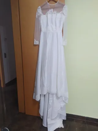 Comprado en Almacen de la novia. Precio original 750€ Mido 1.58 la parte de adelante esta a esa a medida, la cola es mas larga
