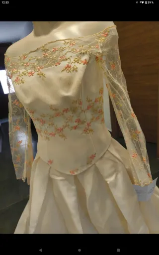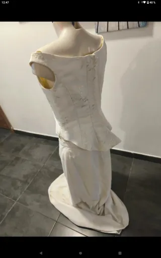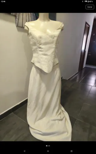 Elegante vestido de novia de dos piezas, listo para tu gran día. Color blanco-crema Se vende sin velo. - Diseño de corte clásico. - Tejido de satén. - Parte de arriba con detalles florales muy bonitos Medidas de la parte de arriba: Largo 39cm Ancho 40cm Hueco brazo 16cm Falda: 160cm largo parte de atrás 103cm largo parte de delante Cintura 37cm aprox.
