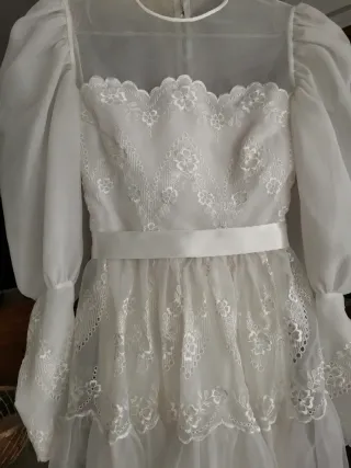 Elegante vestido de novia confeccionado en organza y precioso velo. Presenta un diseño con mangas abullonadas y detalles de encaje. - Mangas largas abullonadas. - Cuerpo con aplicaciones de encaje. - Cinturón de satén. - Falda con varias capas de organza. - Adornos florales bordados en la falda. - Borde inferior con puntilla de encaje. - Le falta el revestimiento del último botón de la espalda