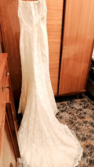 Elegante vestido de novia con un diseño de encaje y corte sirena. Perfecto para una boda especial. - Tejido de encaje detallado. - Corte sirena que realza la figura. - Espalda descubierta con tirantes finos. - Cola larga con borde festoneado. Vestido de Pronovias. blanco roto de encaje y strass, regalo el can-can de la misma talla. Ambos talla 36.