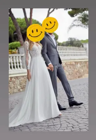 Vestido de novia elegante, usado una sola vez. - Diseño con encaje. - Mangas largas de encaje. - Cinturón fino en la cintura. - Falda amplia con poca cola. Talla M 38. Muy cómodo. Preguntar precio por privado.