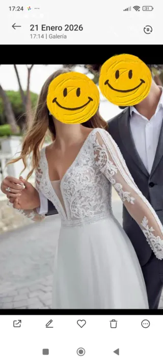 Elegante vestido de novia de Alberto Palatchi. - Diseño con escote corazón. - Manga larga. - Detalle de pedrería en la cintura. -Estilo sirena y espalda abierta que se caracteriza por su simplicidad y elegancia Me casé el 15 de Noviembre del 2025, sólo puesto ese dia y se entregaría lavado y planchado por tintorería. Mi talla es entre 40/42