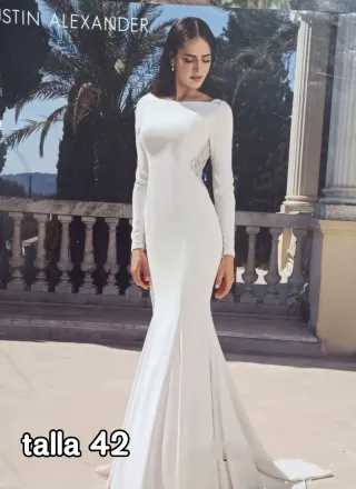 Vestido de novia elegante y moderno, con un diseño que realza la figura. Elaborado en georgette Talla 42 Directo de tienda - Manga larga. - Espalda descubierta con detalles de pedrería. - Cierre de botones forrados a lo largo de la espalda. - Corte sirena. - Cola larga.