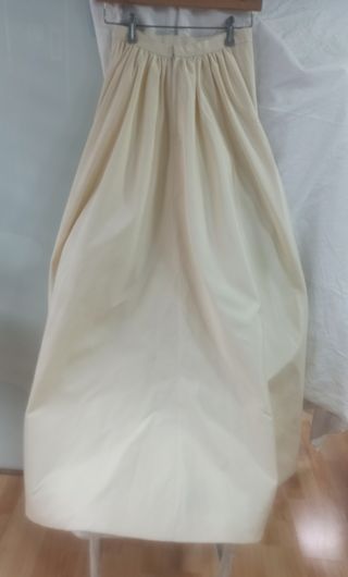 Falda larga, color mantequilla claro, forrada, cremallera en la parte de atrás. Medidas: largo total 118cm. Cintura 66 cm. Vuelo total 366 cm. Está sin estrenar aunque no tiene etiqueta.