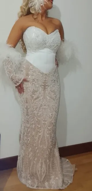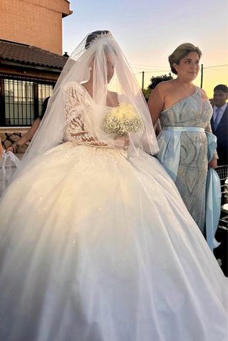 Incluye: ✨ Vestido exterior (ceremonia) Sobrefalda estructurada de satén con caída espectacular. Aporta un look clásico, sofisticado y muy elegante. Tiene cola recogible para bailar. ✨ Vestido interior (fiesta) Vestido palabra de honor completamente cubierto de pedrería y bordados, muy luminoso y especial. Puede llevarse solo tras retirar la capa exterior. También cuenta con cola recogible, muy cómodo para la celebración. ✨ 2 velos con detalles de perlas – Velo largo con caída impresionante – Velo corto para ceremonia. Ambos con peineta incorporada, fáciles de poner y quitar. Talla: 36 (S). Altura: 1,76 m. ➡️ El vestido es muy largo