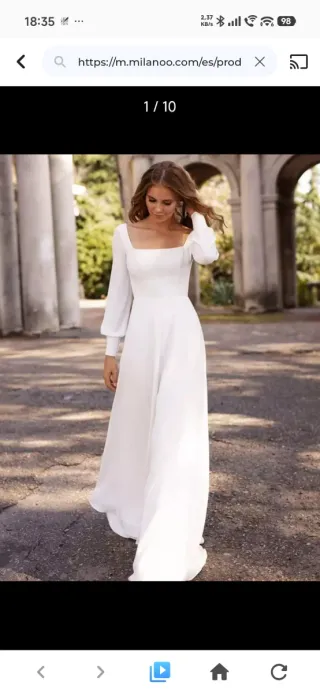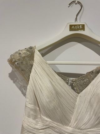 Vendo este espectacular vestido de Aire Barcelona, modelo Nara, estilo Boho chic. Con silueta en línea A, realizado en muss con detalles en guipur y pedrería. Muestra un escote en V, espalda escotada, manga larga y falda con abertura lateral. Estado impecable: Solo se usó unas horas y ha pasado por tintorería profesional. Está guardado en su funda y percha original, libre de manchas. Talla y Ajustes: Es una talla S. Yo mido 1,55 y llevé tacones de 10 cm. Comodidad: A pesar de ser un vestido de novia, es muy ligero y permite bailar y moverse con total libertad durante toda la celebración.