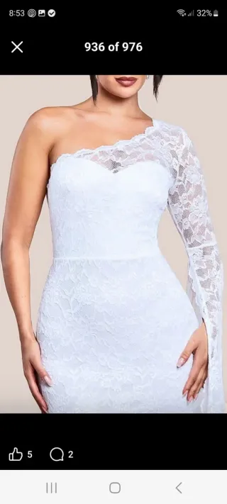 Elegante vestido de novia con detalles de encaje. - Diseño de un solo hombro. - Manga larga de encaje. - Corte ceñido.