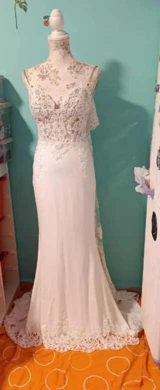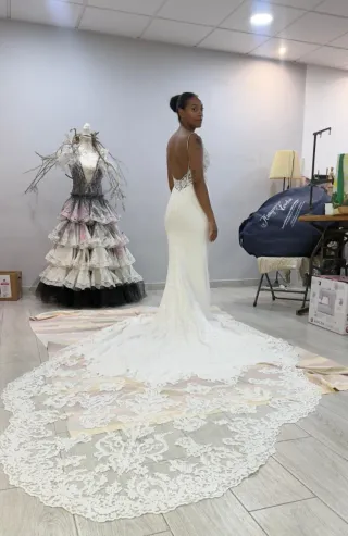 Elegante vestido de novia con un diseño de encaje intrincado y una larga cola. - Espalda descubierta con tirantes finos. - Detalles de encaje en el corpiño y la cola. - Corte sirena que realza la figura. Tiene algunas imperfecciones en la cola y hay que llevarlo a la tintorería