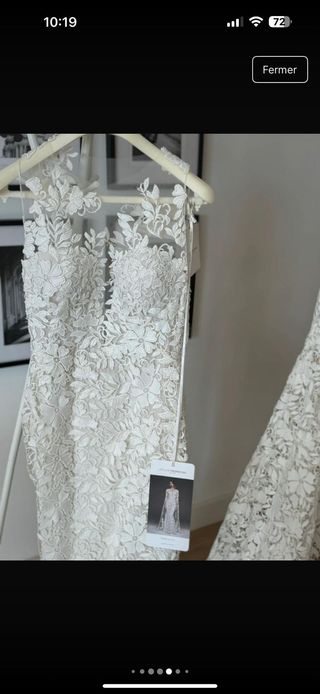 El vestido se compró a principios de año en Pronovias, en Málaga, y solo se usó un día para la boda. Después, se limpió profesionalmente en el salón Bridal Art, por lo que está como nuevo. La novia de las fotos mide 178 cm y pesa 65 kg. El vestido corresponde aproximadamente a la talla 38. El vestido se puede probar en el estudio profesional Bridal Art en Málaga, en C. Alcalde Segalerva Sierra, 8. El precio de 930 € ya incluye los arreglos básicos en Bridal Art: acortar la longitud del vestido y ajustar la silueta. Póngase en contacto conmigo para obtener más información o para concertar una prueba.