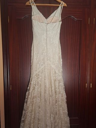 Elegante vestido de novia de Pronovias.(2 años tiene) Esta en perfecto estado y limpio de tintoreria (precio en tienda 2400€) - Diseño de corte sirena. - Encaje detallado en la espalda y falda. - Escote en V pronunciado. - Tirantes finos.