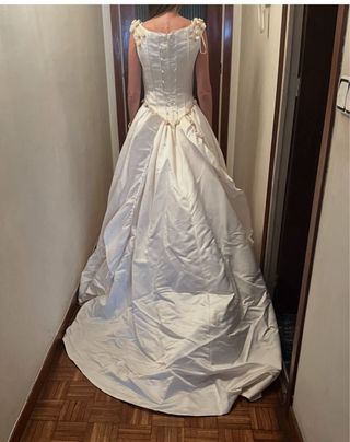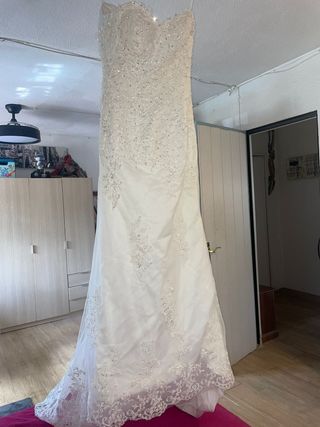 Vestido de novia de palabra de honor con cola de 2 metros. En color blanco roto Mide de pecho aproximadamente unos 95 cm y de cinturilla unos 80 cm