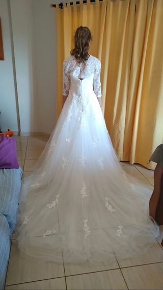 Elegante vestido de novia con un diseño de corte A y detalles de encaje. - Cuerpo con escote palabra de honor. - Cinturón de pedrería. - Bolero de encaje con mangas 3/4. - Falda voluminosa con cola. -Es único ya que le hice quitar y poner detalles a mi gusto. -Regalo bata para antes de vestirse también de pronovias.