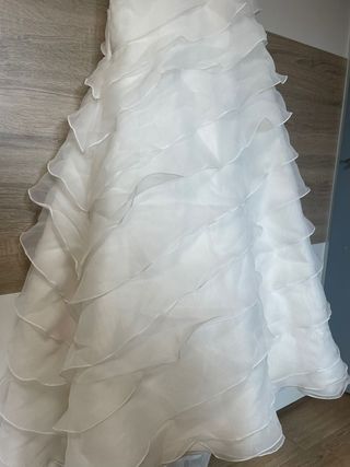 Elegante vestido de novia con un diseño de falda con volantes. - Escote en V. - Adornos de pedrería y encaje en el corpiño. - Falda con múltiples capas de volantes. - Diseño de cola. - Talla S/M