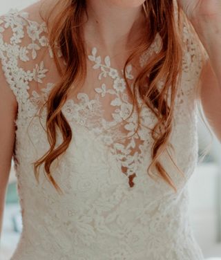 Vestido de novia en perfecto estado. Un diseño elegante y romántico. - Encaje detallado en el escote y mangas. - Falda de tul vaporosa. - Cierre con cordones en la espalda.