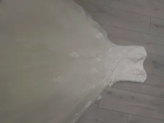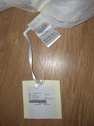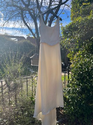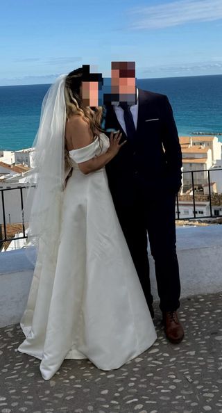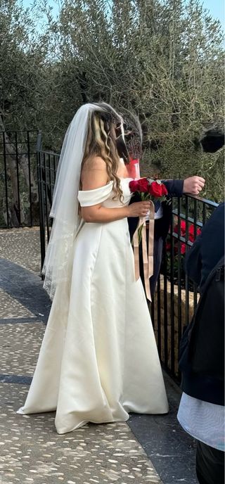 Usado solo en la Boda (junio 2024) Precio original: 1500 euros Tengo factura para que podáis verificar. Marca: Pronovias Talla aproximada es la S porqué está ajustado a medida. Mi altura es de 1,70cm. Está en perfecto estado. Nada roto, ni descosido ni manchado. Lavado y planchado en tintoreria después de la boda. Regalo sandalias blancas con tacon gordo de 4,5cm sin estrenar junto con el vestido. Talla 38. Incluye percha, portavestido, sandalias y CAN-CAN de un aro en el precio