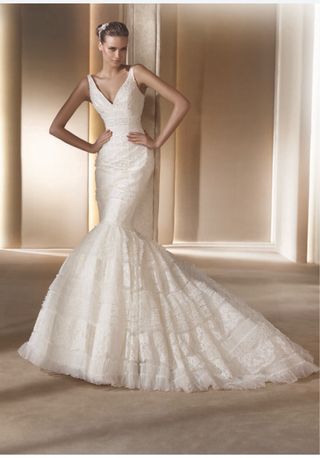 Elegante vestido de novia Pronovias, estilo sirena con detalles de encaje. - Diseño con escote en V. - Falda voluminosa con volantes. - Tejido de encaje intrincado.