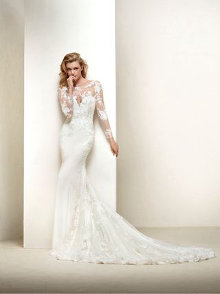 Vestido de novia de la marca Pronovias. - Diseño elegante con encaje. - Mangas largas de encaje. - Escote en V. - Corte sirena.