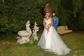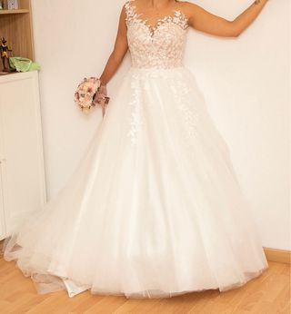 Elegante vestido de novia con detalles de encaje. - Diseño de corte princesa. - Escote ilusión con mangas cortas. - Falda voluminosa con cola. - Adornos florales de encaje aplicados. El precio se puede negociar. Cualquier duda, fotos originales, probar etc...ponerse en contacto conmigo.