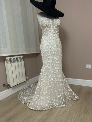 Elegante vestido de novia con un diseño de corte sirena. El vestido está adornado con delicadas aplicaciones florales. - Diseño strapless con escote en V. - Cuerpo ajustado con falda acampanada. - Detalle de flores bordadas por toda la prenda. - Transparencias sutiles en la falda. - Precio negociable