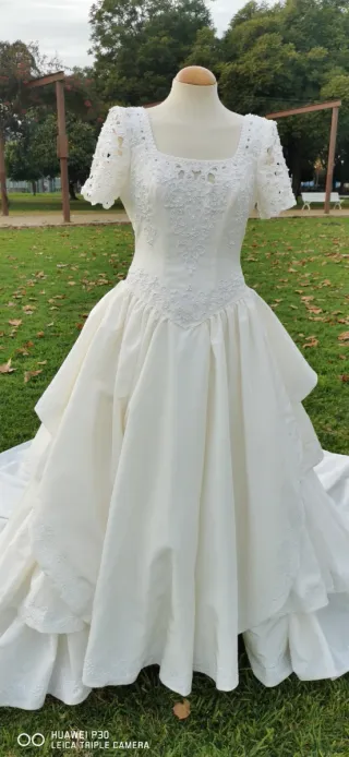 Elegante vestido de novia con un diseño delicado de Pronovias del Paseo de Gracia de Barcelona del año 1.998 Vintage. De organza, seda y guipur. Lleva torerita a juego y guantes. También el cancán de muy buena calidad. Talla 40 de color marfil. Después de la boda lo llevé a la tintorería y ha estado guardado en una caja con lo que hay alguna mancha por el paso del tiempo, se tendría que llevar de nuevo a la tintorería para lavar en seco y planchar.Este vestido me costó 250.000ptas en el 98. Es un vestido del siglo pasado muy elegante. Lo entrego en una caja grande navideña muy bonita con asas. PRECIO A PACTAR.