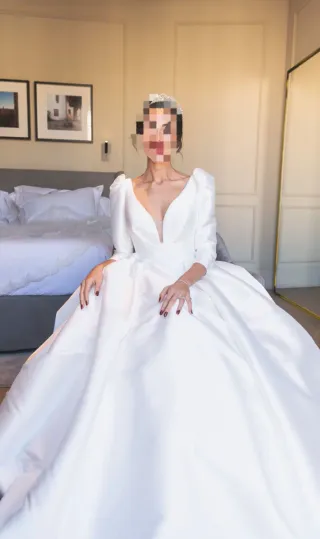 Vendo vestido de novia de alta gama Pronovias Drakar, nuevo, sin estrenar y con etiqueta. Talla 42, color Off-White. Lo compré antes del COVID y, tras aplazarse la boda, elegí otro. Siempre guardado en su funda original. Diseño premium: corte sirena en crepé, escote en V con tul ilusión, encaje artesanal, mangas largas transparentes y cola larga con caída espectacular. En mis fotos está ajustado con pinzas porque yo soy talla 36; se puede entallar sin problema.
