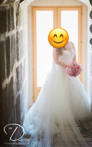 Vestido de novia, talla 38 (con ajustes realizados). Mido 1,72. Es de PRONOVIAS, modelo SEEA (actualmente se encuentra desde 1.990€). El velo tuvo un coste de 300€, pero lo incluyo en el precio total. Después de la boda se llevó a la tintorería para hacerle un lavado intenso, así que está en perfecto estado (menos la parte de abajo que se ha quedado un poco marrón de arrastrarse, pero eso se puede cortar).