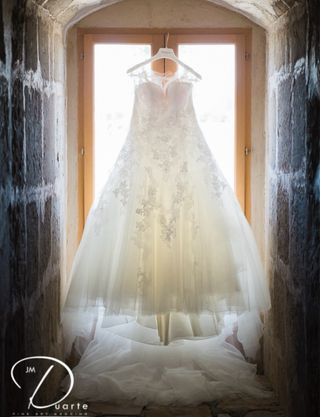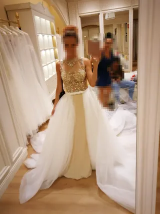 Vestido de novia de la talla 38. El bajo del vestido se encuentra sin tocar, permitiendo ajustarlo a tu medida. Solo lo puse el día de la boda. Está lavado de lavandería y como nuevo. - Diseño elegante y romántico. - Tejido de alta calidad.