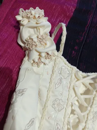 Elegante vestido de novia con un cuerpo adornado con flores. - Cuerpo con detalle de flores. - Falda larga y vaporosa. - Escote palabra de honor. - Cierre trasero con cremallera invisible. Le falta algunas flores. Tiene el bajo del vestido sucio. Se recomienda lavar en sitio especializado por almacén y probador. Se recomienda comprobar las medidas porque talla pequeño. Medidas ( tomadas a mano por lo que puede variar en 1-2cm): Pecho: 44 cm Talle: 25 cm Cintura: 42 cm Largo: 105 cm Largo trasero: 135 cm