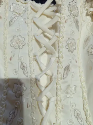 Vestido de novia temporada 2025 Comprado en Sedka diseño del diseñador Jordi Dalmau. Vestido talla 38 entallado a una 36 El vestido se compone de 3 partes ya que es un vestido desmontable. Vestido 3 piezas. Vestido de manga francesa con puntilla en la manga, escote en la espalda con acabado en puntilla. Fajín que marca figura. El cierre es de cremallera con acabado de botones hasta la cola. Tiene una sobre cola de 2 metros aprox que encaja en el fajín con broches Y el toque de la corona una capa que encaja en los botones de los hombros, capa majestuosa. En los hombros tiene unas hombreras que elevan el vestido.