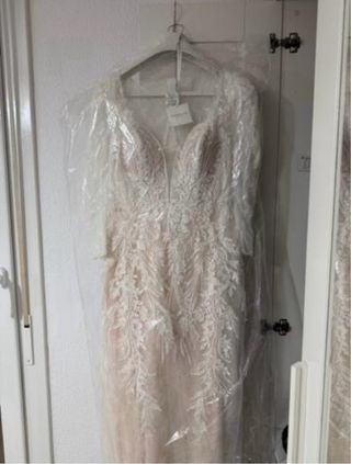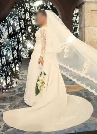 Elegante vestido de novia con detalles de encaje en las mangas y escote.Tiene una cola larga con detalles brillantes hecho a mano - Diseño de corte sirena. - Tejido con caída. - Incluyo el velo en el precio.Si usas un 37 de pie te puedo regalar los zapatos.mis medidas:165 cm, con tacónes 173cm.58 kg y de pecho uso un 95c
