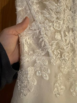 Corte princesa, con encaje, perdrería y transparencias. Color champán, capas de tul y cola. Manga larga tipo tattoo. Una de las capas inferiores de la falda es brillante. Espalda con escote en V. Detalle de botones forrados en espalda y mangas. Escote infinito. Boda el 21 de febrero de 2026. Actualmente en la tintorería. Se regala velo. Mi talla general es 36. De pecho 85C/90B y altura 1.65cm (usé tacones de 9cm). Preguntame para fotos y prueba sin compromiso.