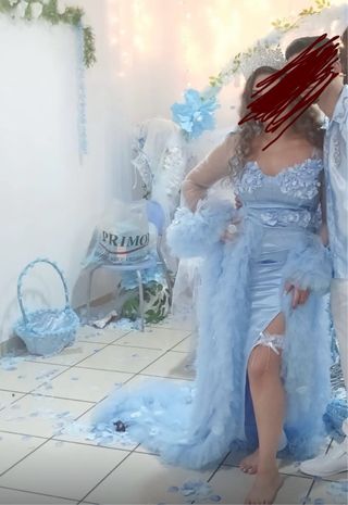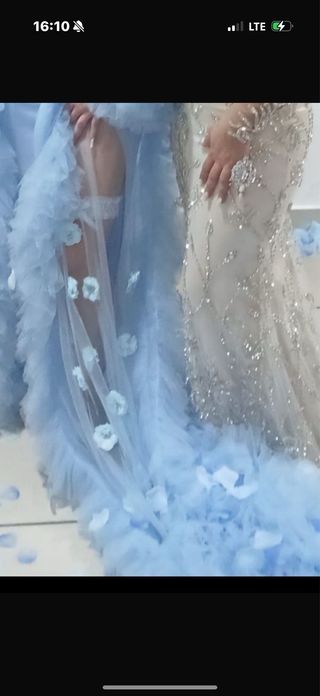 Bata de novia gitana con cola y flores 3D + cama completa también vendo camisa de novio a juego talla S-m - Adornado con flores en el escote. - Mangas largas de tul con volantes. - Falda larga con abertura. - Incluye liga a juego.
