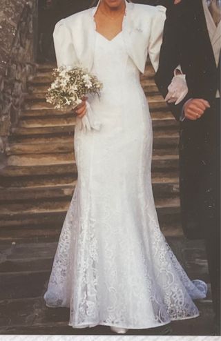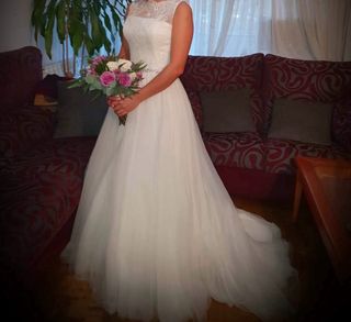 Vendo mi vestido de novia (año 2019), talla 36. Vestido de corte línea A con falda amplia y preciosa caída, cuerpo con encaje floral y escote ilusión delantero. La espalda es en V pronunciada con encaje y botonadura completa, uno de los detalles más bonitos del vestido. Está lavado en tintorería especializada tras la boda (octubre 2019) y guardado correctamente desde entonces. Se encuentra en perfecto estado. Es un diseño atemporal y muy favorecedor.