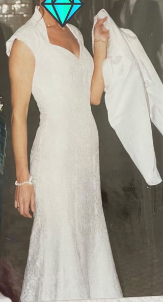 Elegante traje de novia de encaje, talla 40/42. Un diseño que combina sofisticación y un toque romántico.comprado en el pueblo de las novias de cordoba fuente palmera incluye (cancan ,zapatos del número 36 y tocado) super oferta costo 2500 eu - Cuerpo de encaje con manga larga. - Espalda con botones decorativos. - Corte sirena que realza la figura. - Falda con detalles de encaje y cola.
