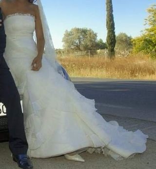 Talla 36/38. Costó 800 euros en total. Es de Rosa Clará. En las fotos se ve como era originalmente, pero se le añadió unas mangas en plumeti, como se ve en las otras dos fotos. Se vende sin las mangas. Mejor ver.