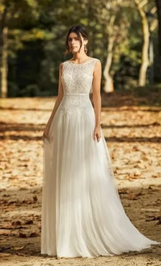 Vestido de novia de la marca Alma Novias, talla 38. Modelo Omega, un diseño elegante y romántico, perfecto para tu gran día. - Cuerpo de encaje con detalles bordados. - Espalda al aire - Falda larga y fluida de tul con ligeros pliegues. - Escote redondo y sin mangas.