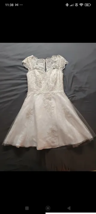 Vestido de novia corto de JJ's House. Comprado en Abril del 2024. Sólo me lo puse a partir del baile nupcial. Está completamente nuevo y limpio, sin ningún roce o enganchón. Es línea A, escote en V, hasta la rodilla. De tul y encaje con la espalda transparente. Talla M color Marfil, no crema. Manga casquillo, botones cubiertos y cremallera trasera.