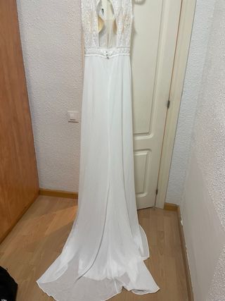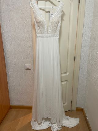 Colección 2025, usado unas cuántas horas porque luego me cambié. lavado profesional, en perfecto estado. precio negociable Precioso vestido de novia de estilo boho chic, ideal para una boda romántica y sencilla. Es un vestido de corte sencillo y elegante, perfecto para una novia que busca un look natural y sofisticado. - Talla: 38 - Diseño con delicados bordados florales - Tejido ligero y fluido - Escote en V - falda de gasa puedo incluir velo de 3 metros el vestido nuevo sale por 1300 euros