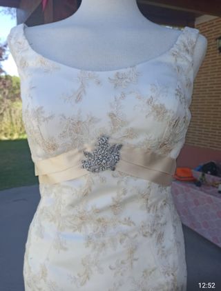 Vestido de novia en buenas condiciones. Diseño elegante con detalles en la espalda. -genial para uso de disfraz. - Espalda con detalles de pedrería y encaje. - Falda con drapeado y caída fluida. - Tejido ligero y vaporoso. - yo lo compré para un uso de disfraz pero no se usó porque me quedaba pequeño. ( la foto es la original de la vendedora anterior, ya que a mí no me cierra)