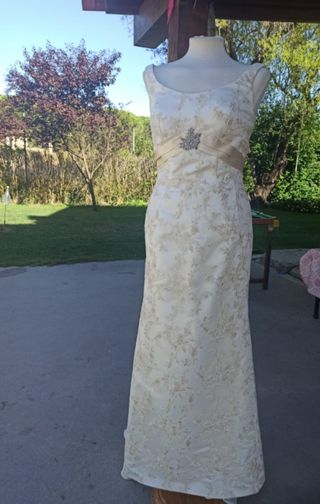 Elegante vestido de novia de la diseñadora LoLy Cubo. Blanco roto. 90% poliéster y 10% otras fibras. La parte superior es de la talla 38, con manga francesa. La falda es de la talla 40 y mide 112 cm por delante y 187 cm por detrás. Precioso, bordado a mano. Regalo cancán.