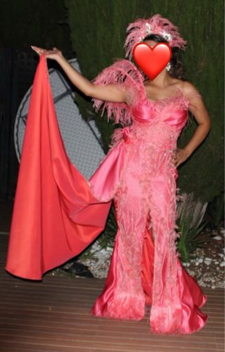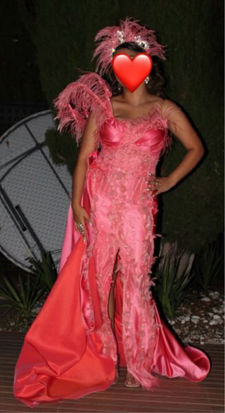 Vestido color coral de pedreria con plumas precioso de novia , puesto unas horas , talla 38/40 echo por ismael fernandez Corona ,anillo y pendientes!!!!!