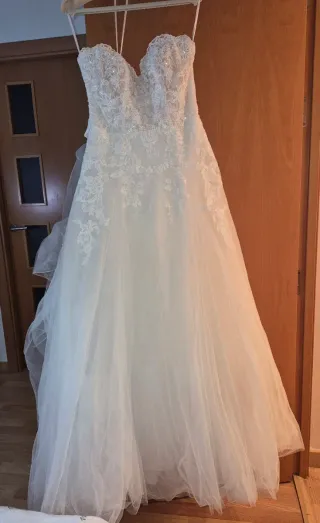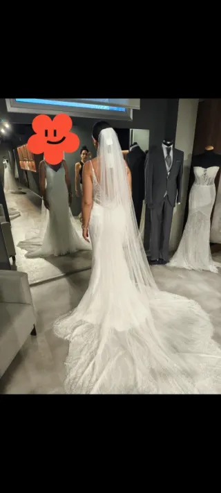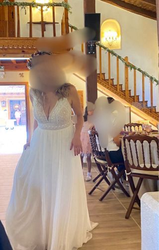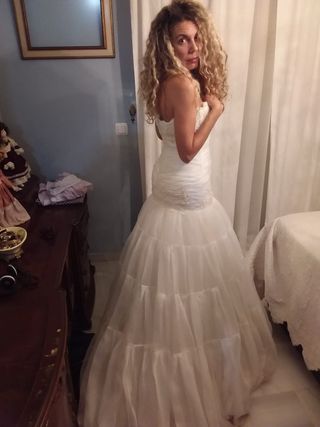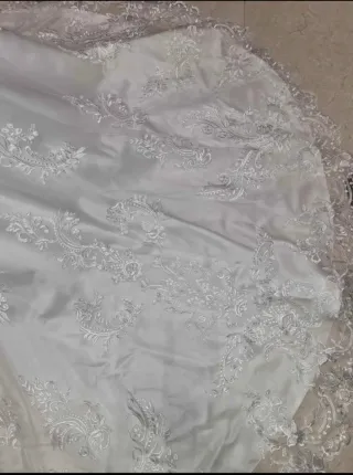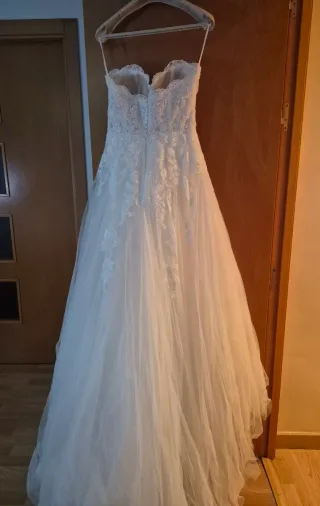 Nuevo con etiquetas. Usado únicamente para probarlo. En perfecto estado aunque algo arrugado de estar guardado. Talla L (40/42), yo uso una 42 y me queda ajustado. Regalo complementos, cinta y diadema oro rosa. Lo vendo porque al final me compré otro para mi boda. ⚠️ Tengo un gato. Todos los productos se envían limpios y bien empaquetados, pero es posible que algún pelito se cuele. Abstenerse alérgicos.