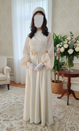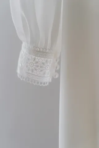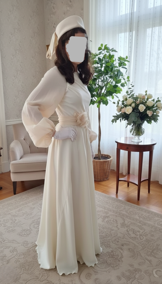 Elegante vestido de novia de estilo retro, inspirado en la moda de los años 40. Un diseño clásico y atemporal. Es tallado en la talla 44 Antigua, equivale a una S-M - Mangas largas de tul con pequeños topos. - Cuello alto con detalles de encaje. - Cuerpo con fajín satinado. - Falda larga con vuelo y tejido con topos.