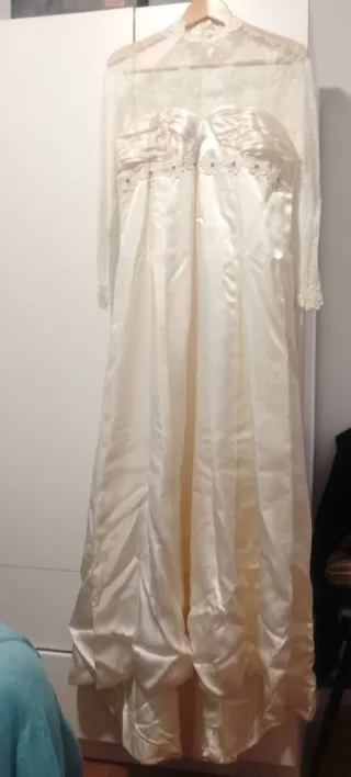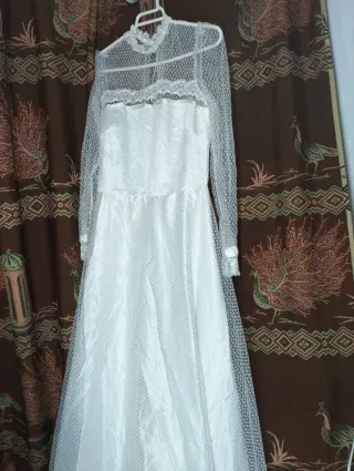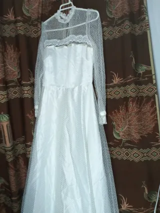 Se vende precioso vestido de novia del año 1984, con encaje, y volantes por detras con un poquito de cola. Tiene cinturon de raso, cremallera para abrochar y el velo blanco. Está hecho a mano por una modista profesional para una altura aproximada de 1,50 cm. y una talla mas o menos entre 40 y 42. Es ideal para una boda con estilo vintahe o retro. Se escucha cualquier tipo de oferta, siempre y cuando sea lógica, jeje. Por favor, solo cotactadme a traves de este chat.
