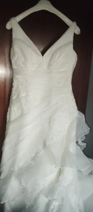 Vestido de novia en excelente estado, talla 40. Un diseño elegante y romántico. - Cuerpo con pedrería y escote asimétrico. - Falda con volantes de tul y encaje. - Cola larga y vaporosa.