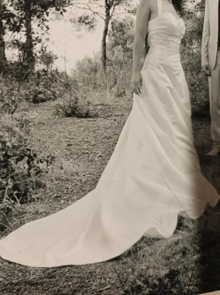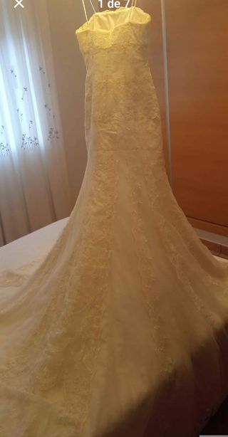 Elegante vestido de novia. - Diseño clásico y atemporal. - Tejido de alta calidad. - Talla 40. - Contorno de pecho 78 centímetros. - Y del cuello hasta la cola Mide 239 centímetros. -No hago envíos. -No me desplazo. -El precio no incluye el transporte.