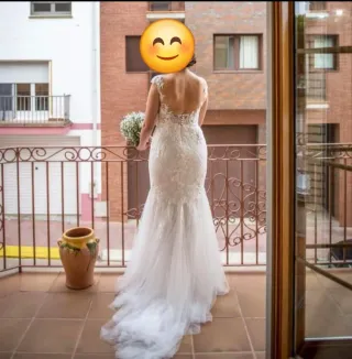 Precioso vestido de novia con una espalda impresionante. Me lo puse solo una vez y está lavado en tintorería. El can can lo compré a parte y entra dentro del precio, lo cortaron a medida con el vestido, no se ve nada. La talla es 40 pero me lo arreglaron de cuerpo. La marca es oreasposa L1013