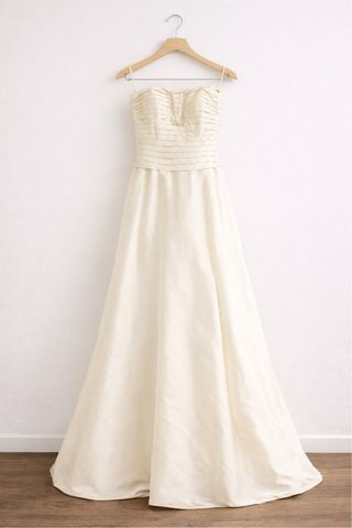 Precioso vestido de novia de color blanco roto, en muy buen estado. Ideal para una boda civil o una celebración íntima. - Escote barco. - Falda larga y fluida. - Confeccionado en tejido satinado.