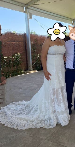 Vestido de novias Nuevo sin estrenar por cierre de comercio, es de encaje y en los laterales es raso, queda puesto precioso La talla quedaría perfecto para alguien que use 40 aunque es una 42 pero da poca talla